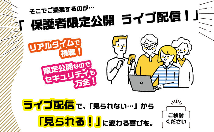 弊社が提案する「学校行事ライブ配信システム」は、子供たちが生きいきとする姿をリアルタイムで視聴できます。保護者の方限定公開なので、セキュリティも万全です。ぜひ、ご検討ください。